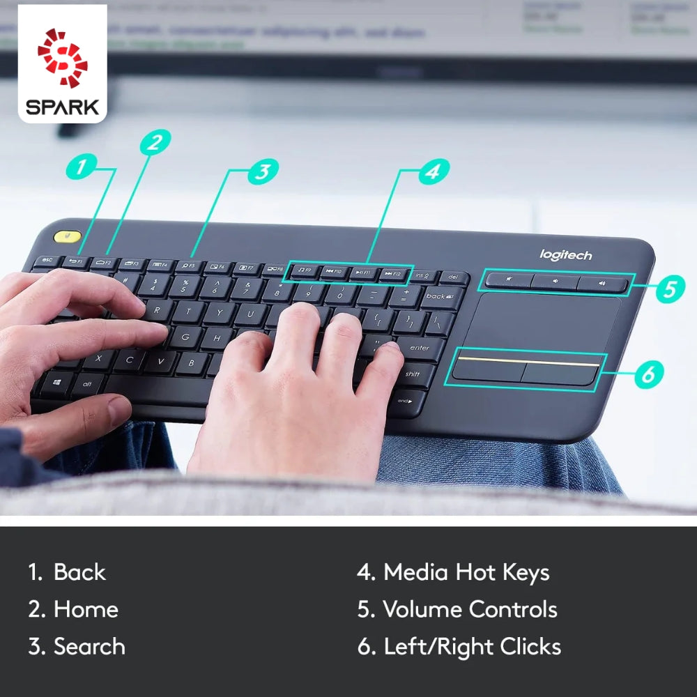 The Logitech K400 Plus wireless touch keyboard combines a full keyboard and integrated touchpad for easy PC-to-TV control. With plug-and-play setup, long-lasting battery up to 18 months, quiet keys, and a 10 m wireless range, it delivers smooth navigation and media control. Compatible with Windows, Android, and Chrome OS, it features a spill-resistant, durable design for reliable everyday use.
